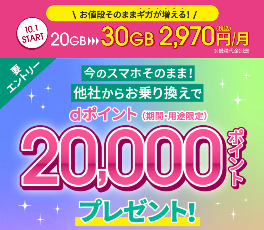 ahamoは2024年10月1日から、月額料金据え置きでデータ容量が20GBから30GB/月に増量されました。それに伴い、dポイントが20,000ポイントもらえるお得なキャンペーンも実施中です。