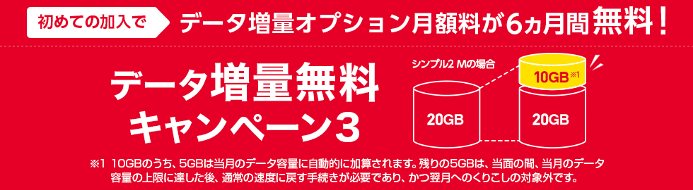 データ増量無料キャンペーン3は、初めてデータ増量オプションに申し込むと、オプションの月額料金が6ヵ月間無料になるキャンペーンです。