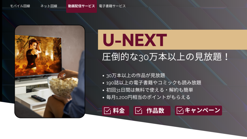 U-NEXTとは、30万本以上の動画や190誌以上の電子書籍が見放題で利用できる、幅広い人気を誇る動画配信サービスです。