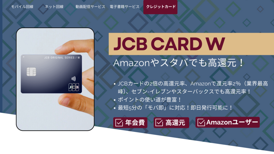 - JCBカードの2倍の高還元率、Amazonで還元率2%(業界最高峰)、セブン-イレブンやスターバックスでも高還元率!